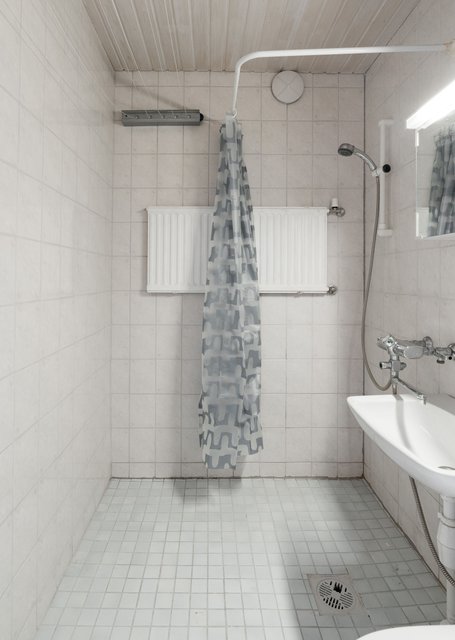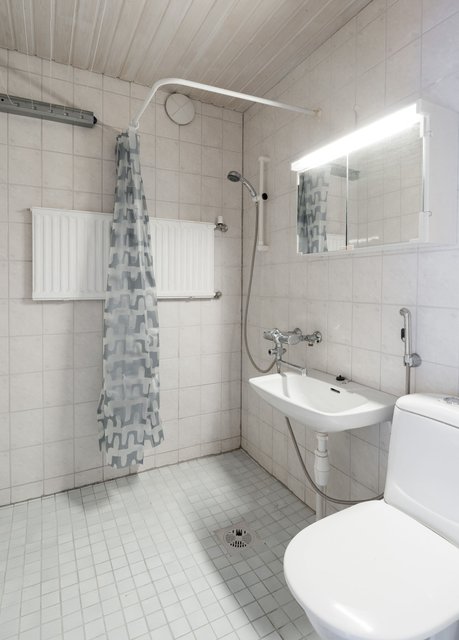 - Suihkuverho, pesukoneliitäntä, suihku, wc-istuin, peilikaappi, pesuallas, ja bidee-suihku