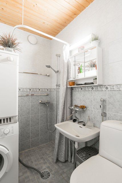 - WC-istuin, suihkuverho, pesuallas, pesukoneliitäntä, ja peilikaappi