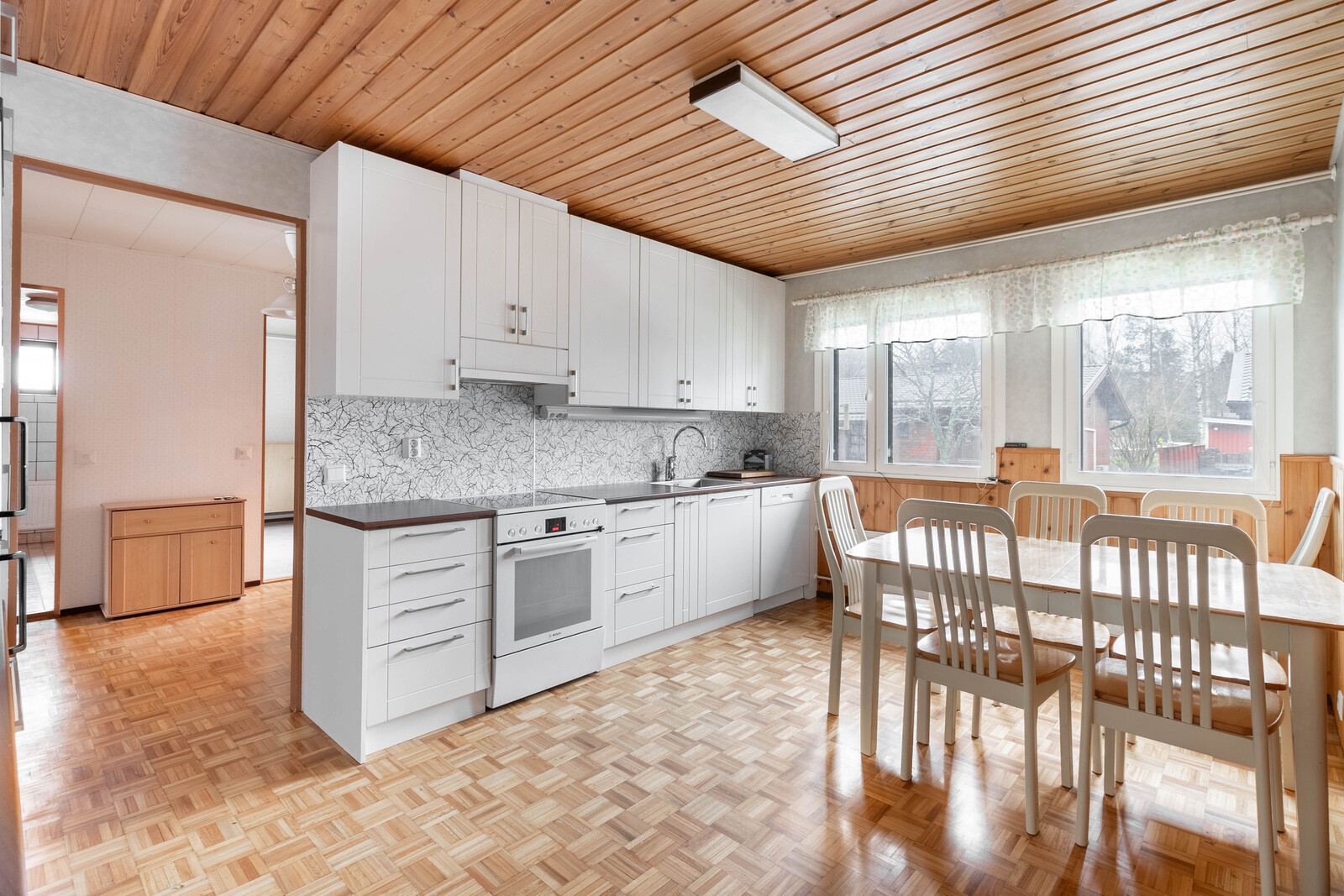 Talon selkeä ja toimiva pohjaratkaisu palvelee arjen tarpeita mainiosti. Kolme avaraa makuuhuonetta sekä suuret ikkunat tuovat runsaasti luonnonvaloa koko kotiin. Tilavat oleskelualueet sopivat niin arjen askareisiin kuin juhlahetkiin, ja tilava keittiö tarjoaa riittävästi tilaa myös suuremmalle ruokapöydälle ja yhteisille aterioille.