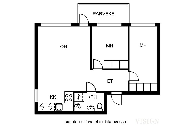 Tässä kodissa kaksi tilavaa makuuhuonetta, sekä osittain avoimen keittiön ja olohuoneen yhdistelmä, jonka jatkeena parveke noin länteen. Neliöiltään tilavamman tuntuinen koti.
