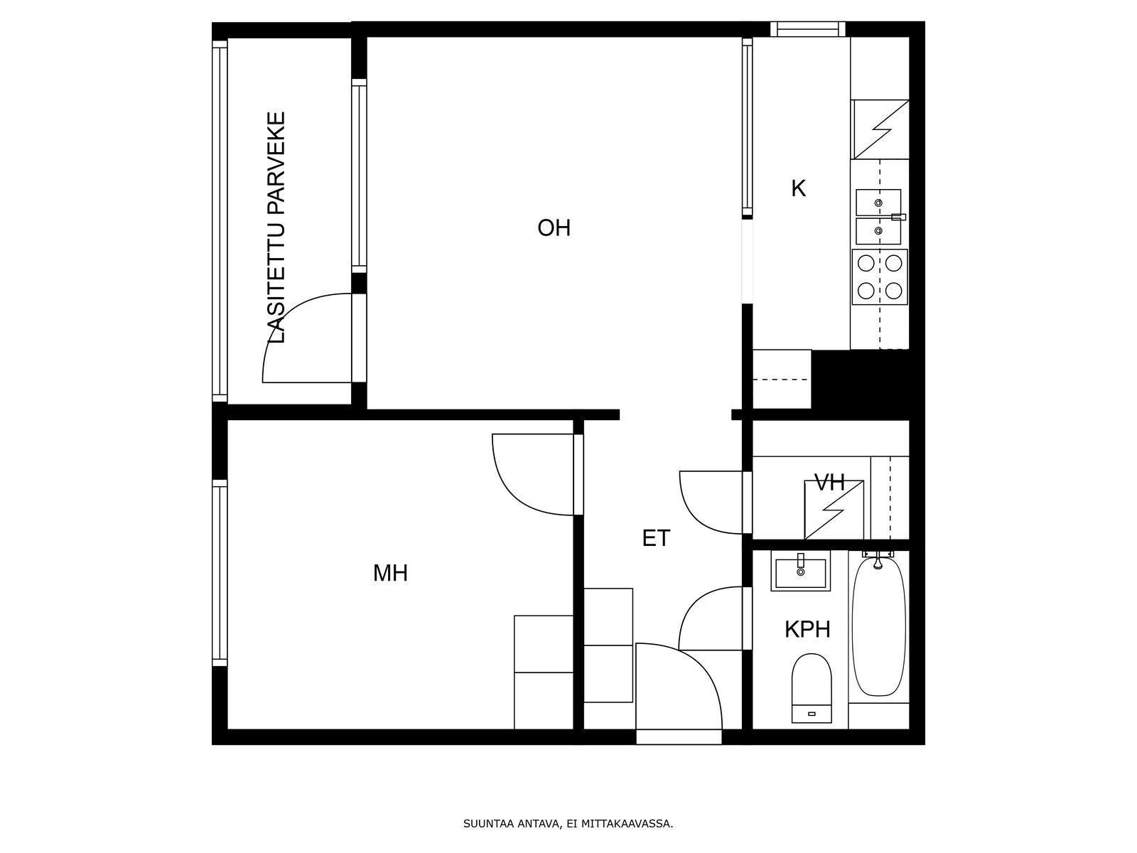 Asunnossa on tilava olohuone, erillinen keittokomero, makuuhuone, kylpyhuone, sekä vaatehuone. Lasitetulta parvekkeelta rauhalliset luontonäkymät.