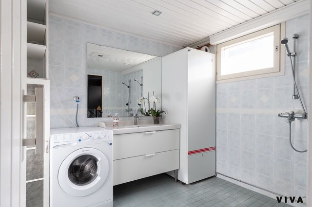 - Suihku, pesukoneliitäntä, lattialämmitys, peili, pesuallas, ja allaskaappi