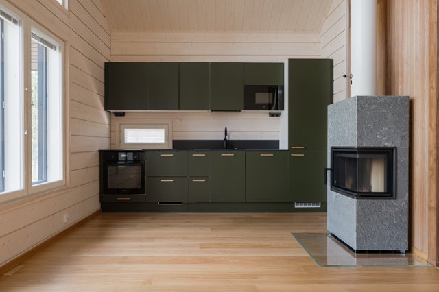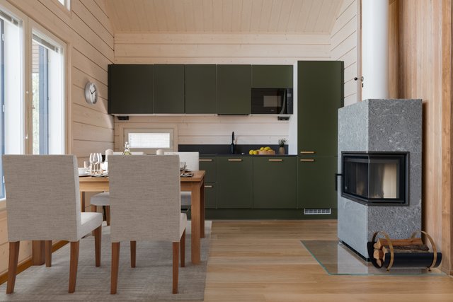 Talon sydän on olohuoneen, keittiön ja ruokailutilan muodostama yhtenäinen tila, jossa suuret ikkunat tuovat luonnonvalon ja maisemat osaksi sisustusta. Tulikiven tulisija luo lämpöä ja tunnelmaa talvi-iltoihin, ja avara tila kutsuu viihtymään yhdessä. Moderni Puustellin keittiö on varustettu integroiduilla kodinkoneilla ja suunniteltu helpottamaan arkea lomalla. Kahden makuuhuoneen ansiosta tila soveltuu erinomaisesti niin perheille kuin ystäväporukoille – toinen makuuhuone sijaitsee alakerrassa ja toinen yläkerrassa, mikä mahdollistaa oman rauhan.