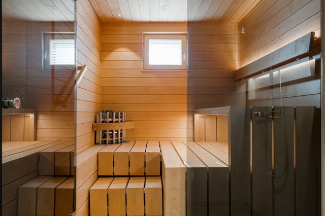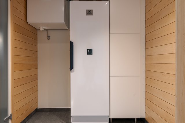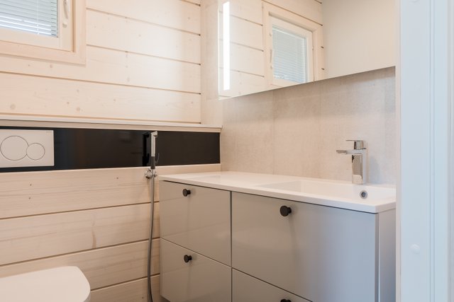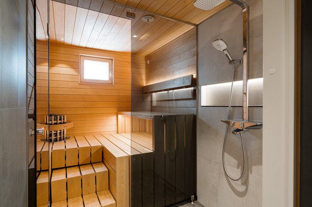 - Pesutilat ovat todella tyylikkäästi toteutettu ja ne yhdistyvät lasiseinällä loma-asunnon saunaan. Pesutiloihin kulku tapahtuu pukuhuoneen kautta, joka lisää käytännöllisyyttä isomman seurueen kesken.