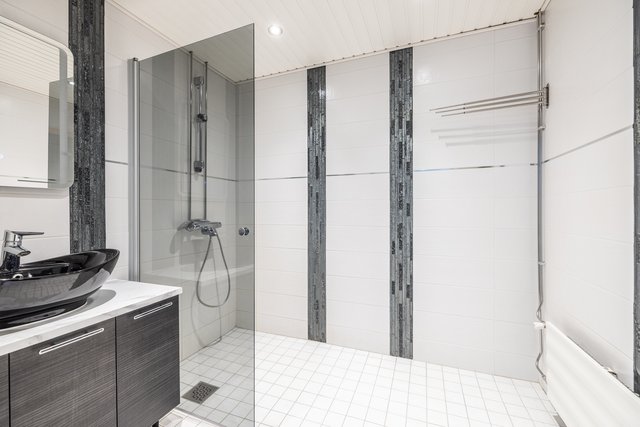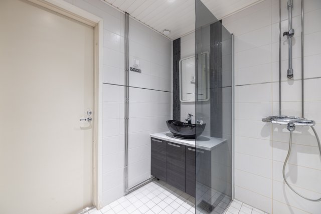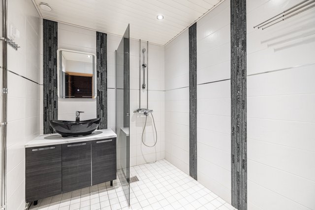 - Suihku, suihkuseinä, lattialämmitys, peili, pesuallas, ja allaskaappi