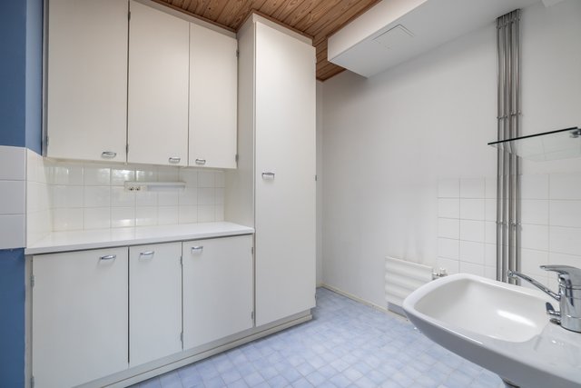 - Pesukoneliitäntä, lattiakaivo, pesuallas, pyykkikaapit, pöytätaso, ja tila pesutornille