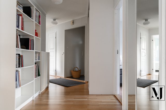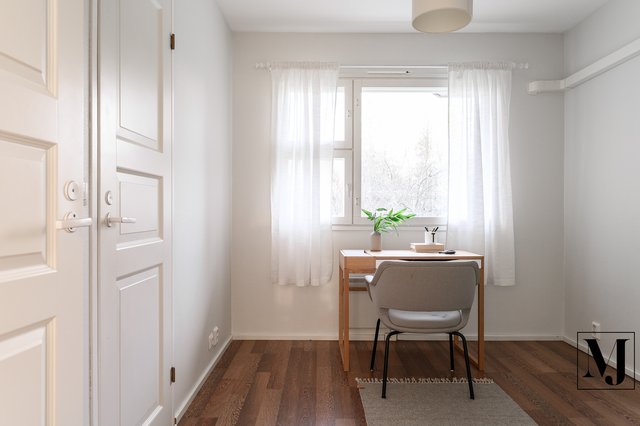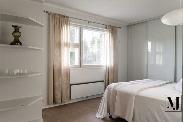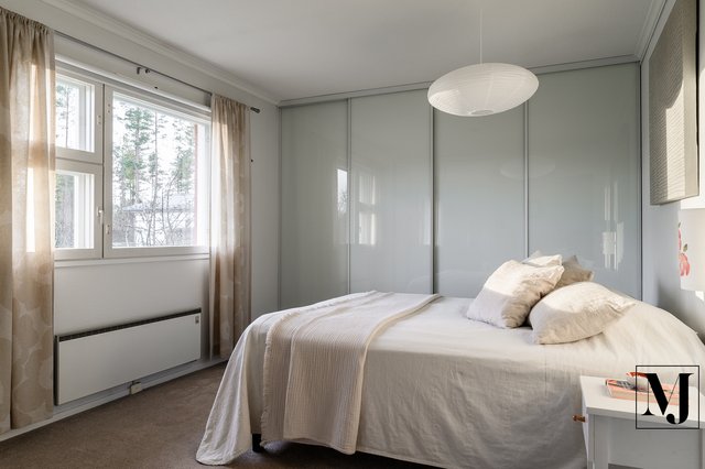 - Päämakuuhuoneessa on miellyttävä kokolattiamatto ja runsaasti kaappitilaa. Kahdessa makuuhuoneessa on vaatehuoneet ja laminaattilattiat. Kaikkien huoneiden seinät on juuri maalattu, mikä tuo tiloihin raikkaan ja huolitellun ilmeen.