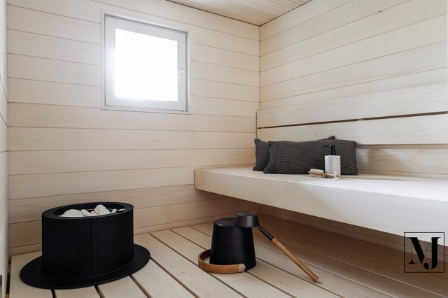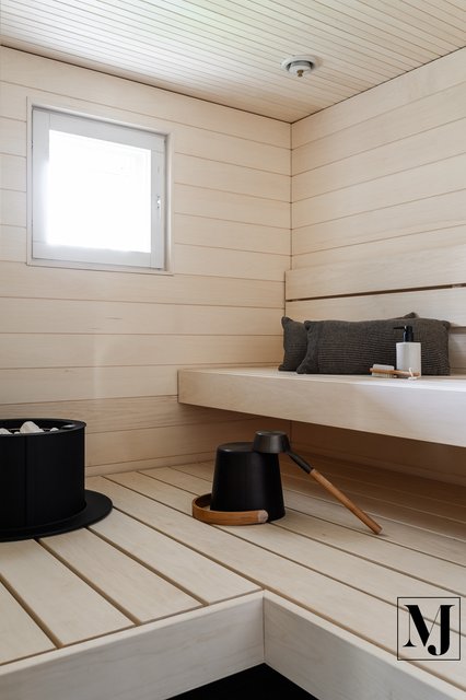 - Saunassa on vaaleat, öljyvahatusta haavasta lauteet, seinä- ja kattopaneelit. Etäohjattava tornikiuas.