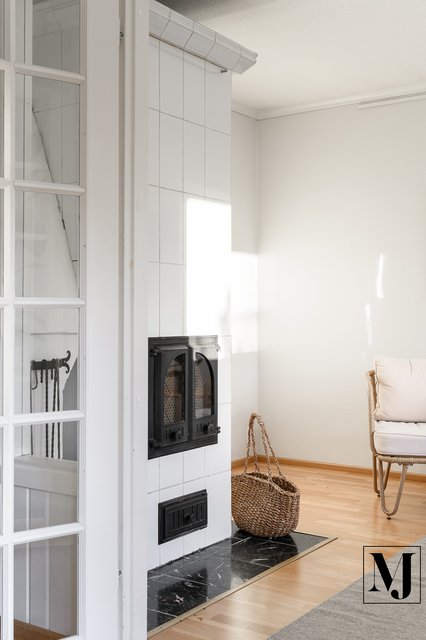 - Takkahuoneeseen kuljetaan tyylikkäiden lasipariovien kautta. Kaunis kaakelitakka joka tuo tunnelmaa kotiin. Takkahuoneesta on käynti lasitetulle terassille.