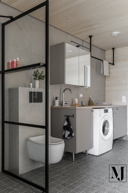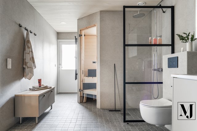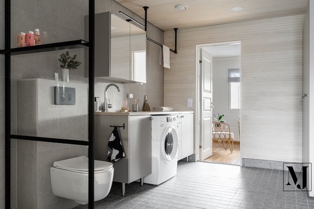 Tämä kylpyhuoneen ja kodinhoitotilan kokonaisuus hurmaa spa-henkisellä tunnelmallaan. Tilat on uudistettu 1/2023, ja niissä yhdistyvät käytännöllisyys sekä rentoutumiseen kutsuva ilmapiiri. Pehmeät sävyt tuovat lämpöä ja mustat yksityiskohdat antavat modernia ilmettä. Kylpyhuoneesta avautuu käynti suoraan takapihan terassille, mikä tekee tilasta erityisen viihtyisän myös saunailtoina.