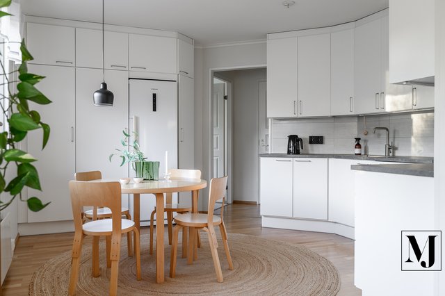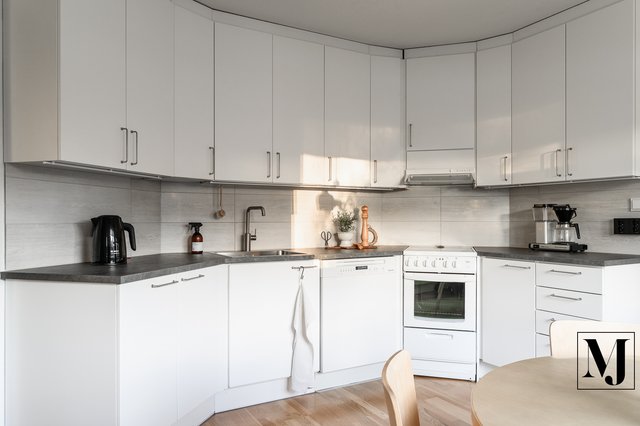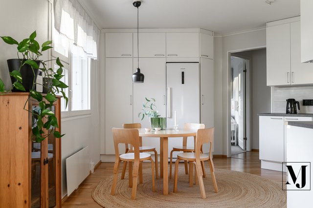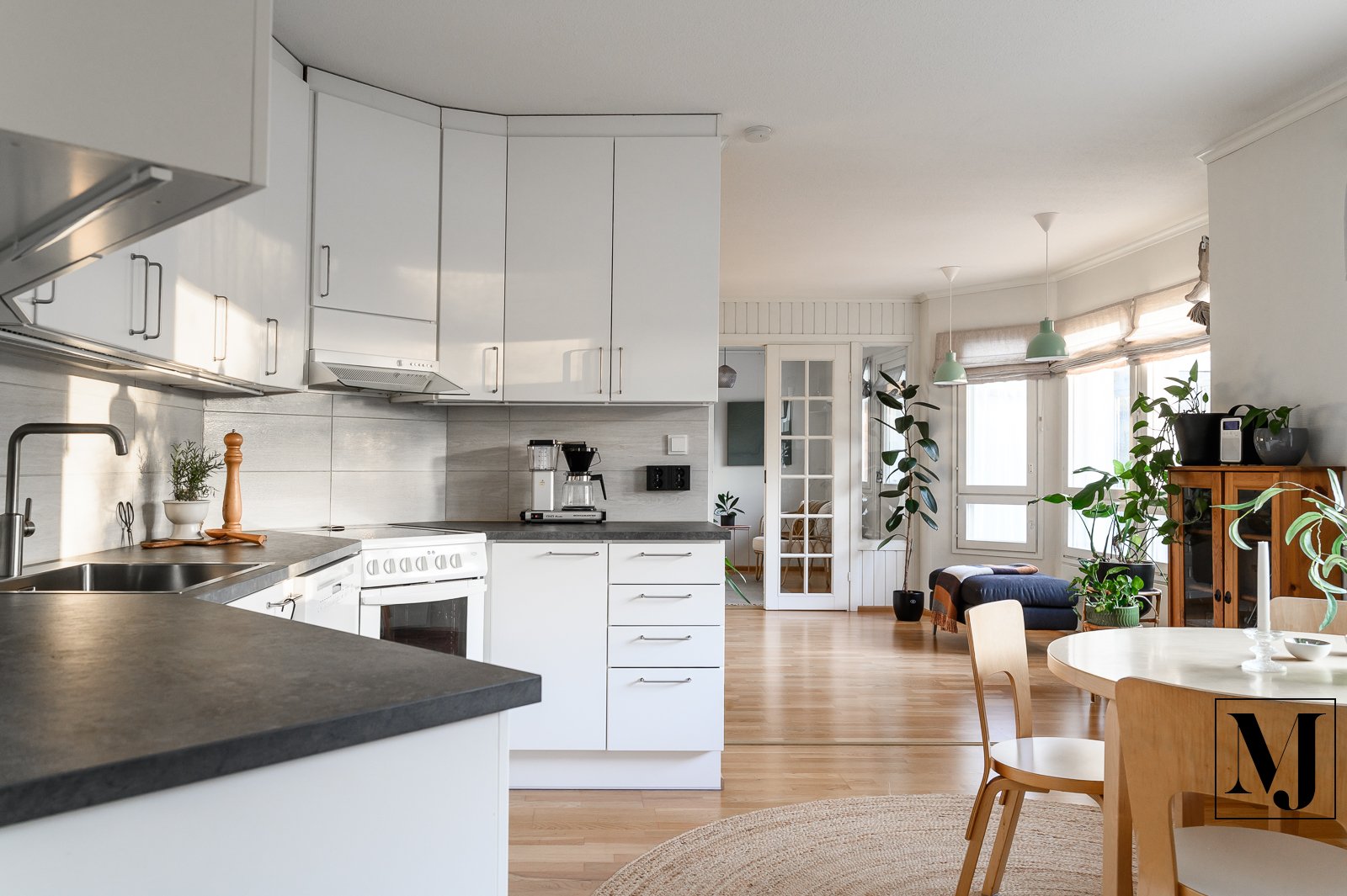 - Keittiö on vaalea värimaailmaltaan ja erittäin valoisa. Keittiötilaan mahtuu hyvin ruokailuryhmä. Keittiön ovet, tasot, hana, allas ja kaapin sokkelit ovat uusittu vuonna 2024. Astianpesukone on vuodelta 2023 ja jääkaappi vuodelta 2017. Varusteluun kuuluu myös keraaminen liesi uunilla. Lattiamateriaalina on parketti.