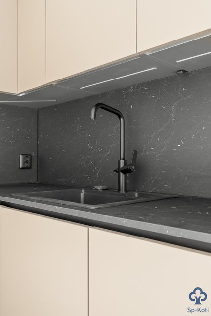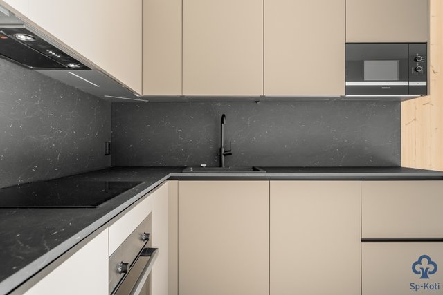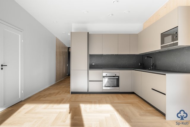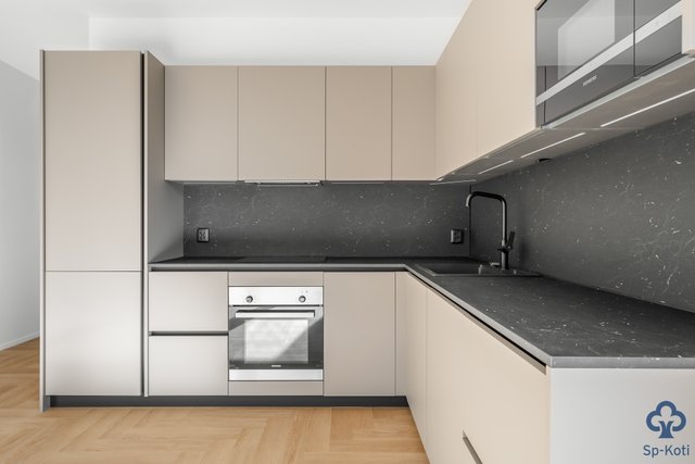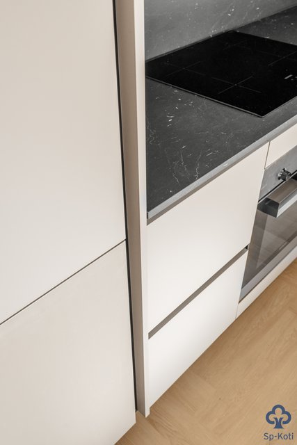 - Kaapistot, jääkaappipakastin, induktioliesitaso, kalusteuuni, liesituuletin, mikroaaltouuni, astianpesukone. Kaikki koneet ovat integroituja. Lattia vinyylilankkua.