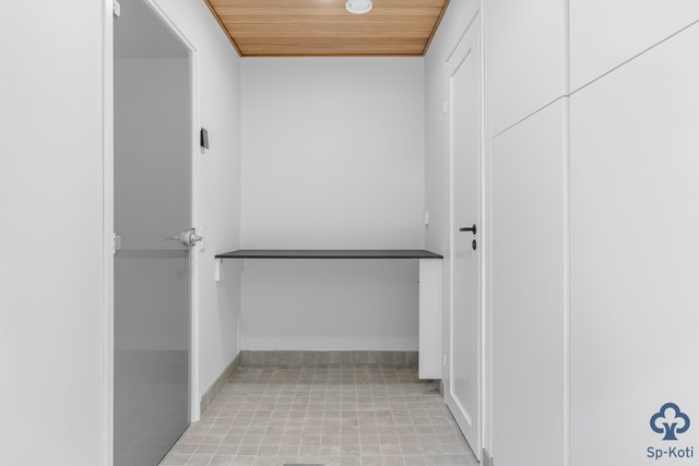 - Laattalattia, seinät maalattu, työtaso, pesukoneliitäntä, tilaa kuivausrummulle.