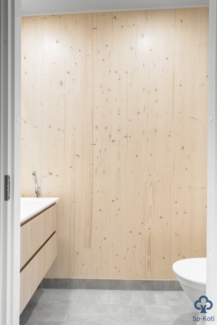 - Lattia vinyyliä, seinät CLT/ levyseinät maalattu.