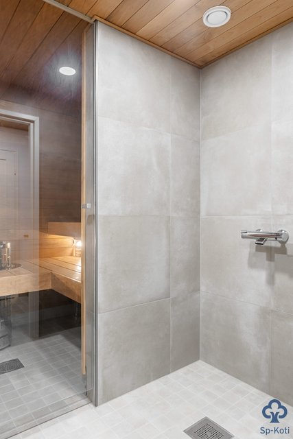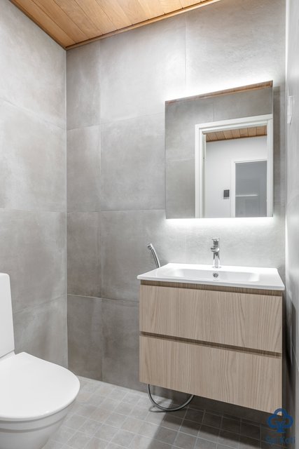 - Kokonaan laatoitettu, peili, pesuallas, allaslaatikosto, wc-istuin.