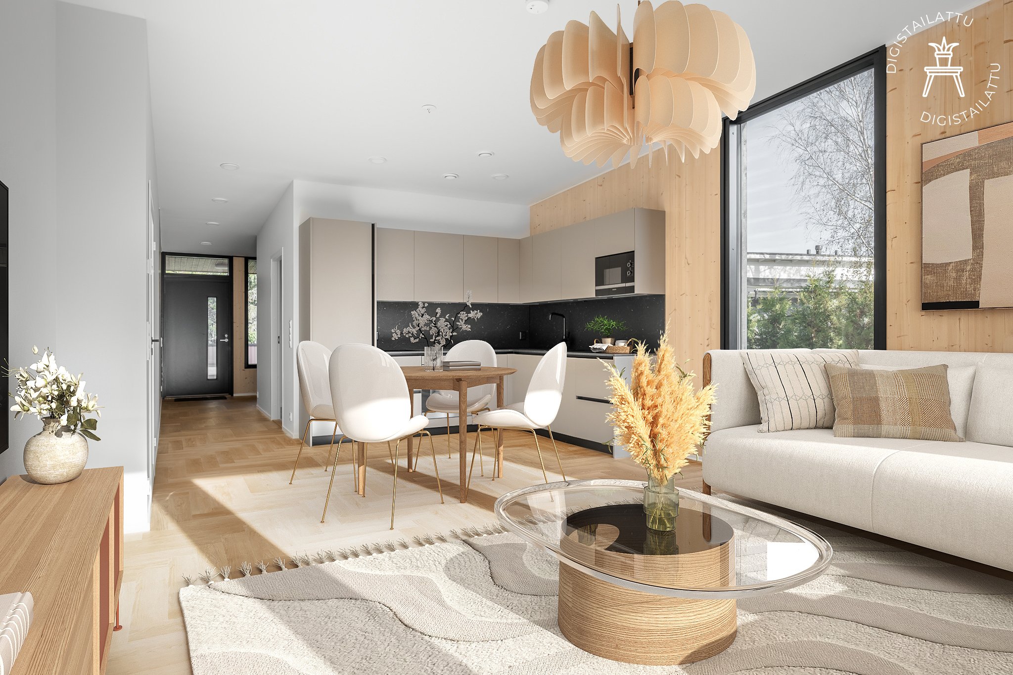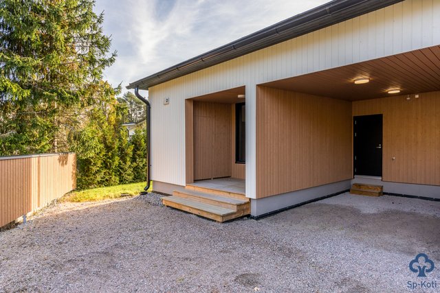 Tämä moderni paritalo tarjoaa 83,5 neliötä viihtyisää ja käytännöllistä asuintilaa, johon kuuluu olohuone ja keittiö, jotka ovat avaraa ja yhtenäistä tilaa, kaksi makuuhuonetta sekä sauna-, pesu- ja kodinhoitotilat. Tyylikkäät vinyylilattiat, laatoitettu kylpyhuone ja oma sauna tarjoavat rentouttavia hetkiä arjen keskellä. Kodinhoitohuoneessa on tilaa sekä pesukoneelle että kuivausrummulle. Lisäksi on kaksi varastoa, autokatos ja pihapaikka toiselle autolle. Kohteessa on energiatehokas poistoilmalämpöpumppu ja kaikissa tiloissa miellyttävä vesikiertoinen lattialämmitys.