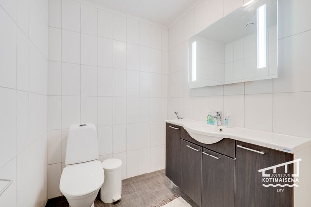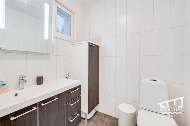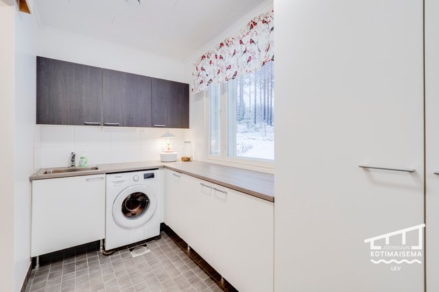 - Pesukoneliitäntä, pesuallas, lattialämmitys, ja kaapistot