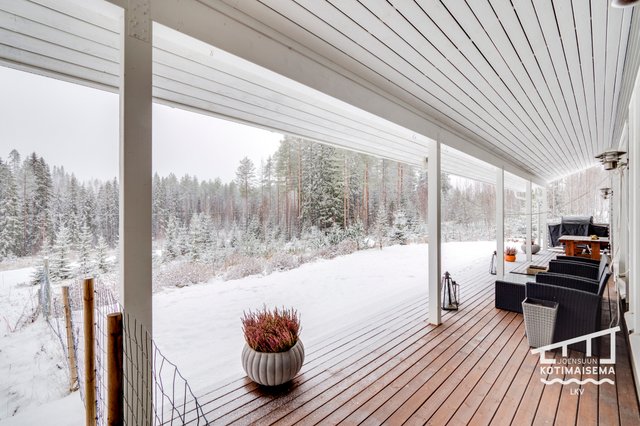 Oma, yli puolen hehtaarin, tontti tarjoaa runsaasti tilaa lasten leikeille, pihapeleille ja puutarhaharrastuksille. Pihapiiriä täydentää kahden auton autokatos lämpimällä varastolla. Sijainti on ihanteellinen: metsien ja luonnon keskellä, mutta silti sujuvien liikenneyhteyksien varrella – Joensuun keskusta on noin 25 kilometrin päässä.