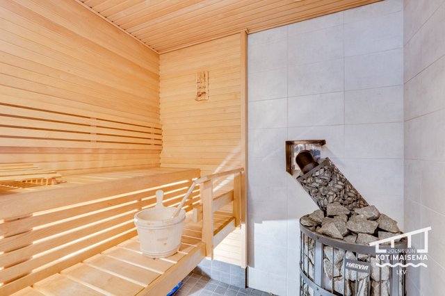 Talon sydän on avara olohuone, josta avautuvat kauniit näkymät ympäröivään luontoon. Moderni keittiö on varusteltu nykyaikaisilla laitteilla ja käytännöllisellä saarekkeella – kokonaisuus, jossa arki ja yhdessäolo sujuvat vaivattomasti. Kylpyhuoneessa mukavuutta tuo lattialämmitys, iso pukuhuone ja lasiseinällä rajattu sauna tarjoaa rentouttavat löylyt perinteisen puukiukaan lämmössä.