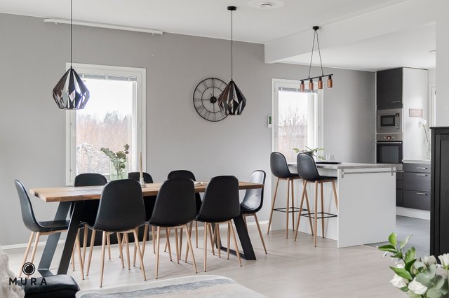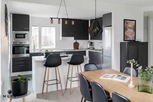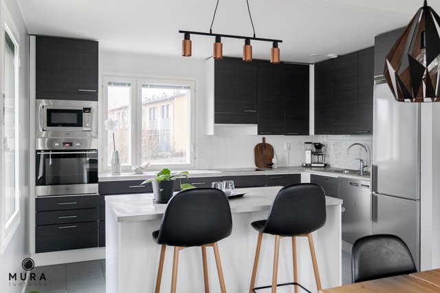 - Jääkaappi/pakastin, astianpesukone, induktioliesti, liesituuletin, erillisuuni, mikroaaltouuni, saareke, kaapistot.