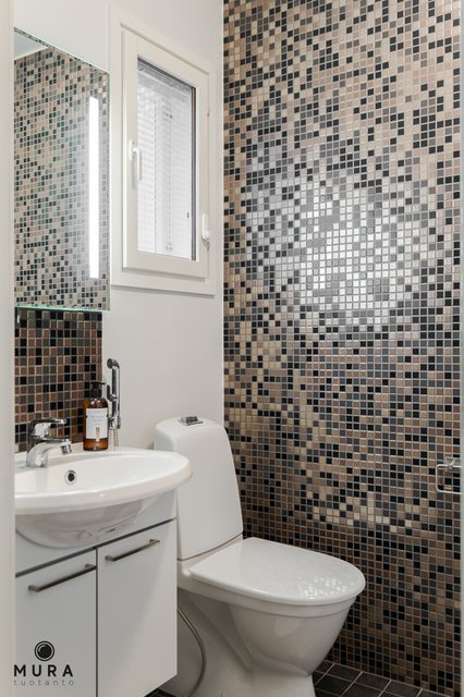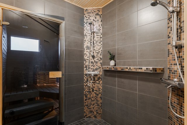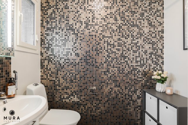 Kylpyhuoneessa on kaksi suihkua, ja sauna tarjoaa rentoutumista arjen keskellä. Lisäksi asunnossa on kaksi erillistä wc:tä, mikä helpottaa perheen arkea. Pesutiloissa on pesukoneliitäntä, joka lisää käytännöllisyyttä.