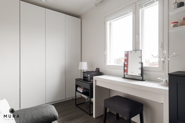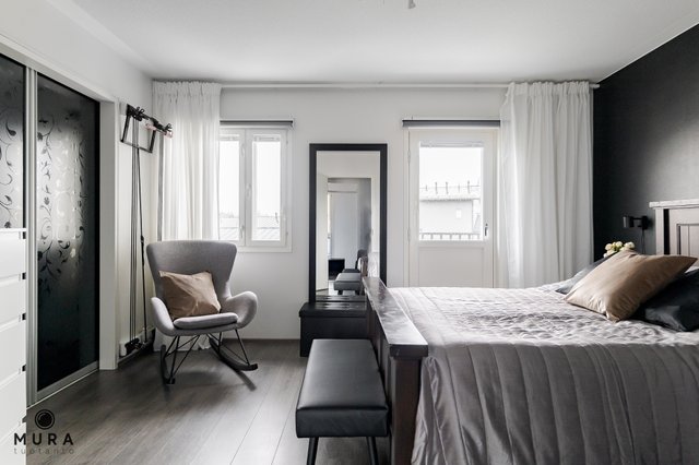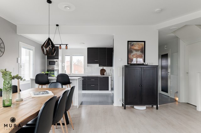 Asunnossa on kaksi makuuhuonetta, mutta kolmannen saa tehtyä tarvittaessa. Tämä antaa mahdollisuuksia monenlaisiin tilaratkaisuihin. Keittiö on hyvin varusteltu ja siellä on muun muassa saareke, joka toimii erinomaisena kokkaus- ja seurustelutilana. Olohuoneen suuret ikkunat tuovat runsaasti luonnonvaloa sisään ja luovat viihtyisän tunnelman.