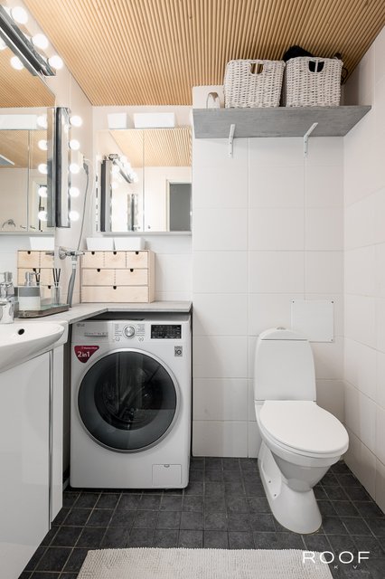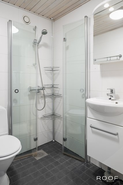 - WC-istuin, suihkuseinä, suihku, lattialämmitys, peilikaappi, pesuallas, ja allaskaappi