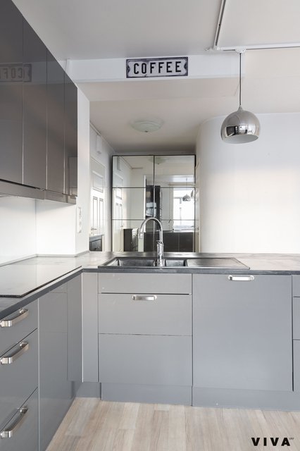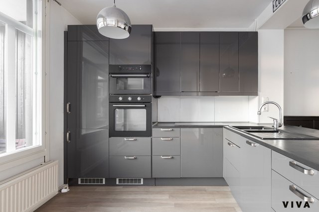 - Avokeittiö, jossa kiiltävät harmaa/musta kaapistot. Kaapistoissa RST kahvat ja hidastimet. Niemekkeessä upotettu komposiittiallas + kromattu kaareva hana, päässä vitriinikaapisto ja molemmin puolin niemekettä kaapistot.