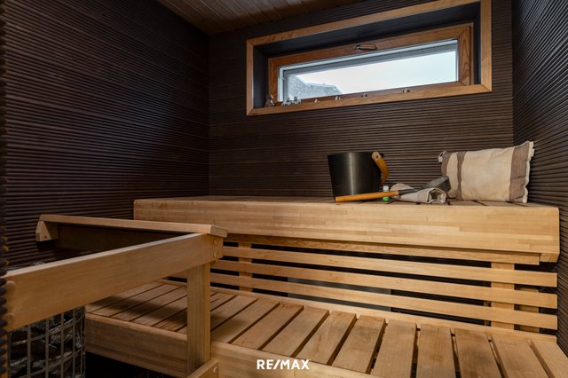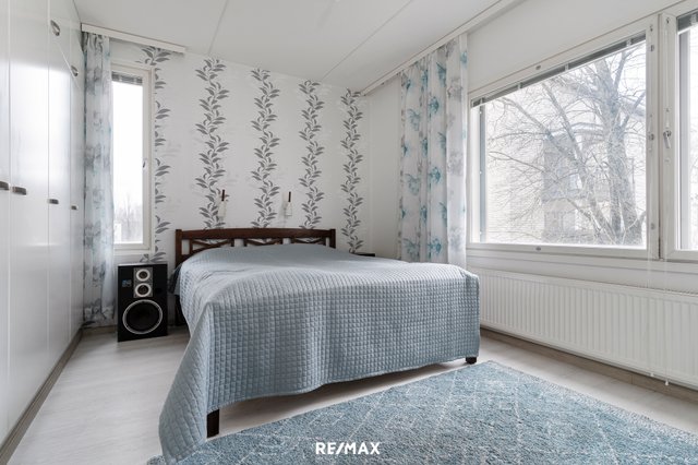 Keittiö on varusteltu nykyaikaisilla laitteilla, ja oma sauna tuo lisämukavuutta arkeen. Makuuhuoneessa on runsaasti luonnonvaloa kahden ikkunan ansiosta, ja seinän levyinen kaapisto tarjoaa hyvin säilytystilaa.