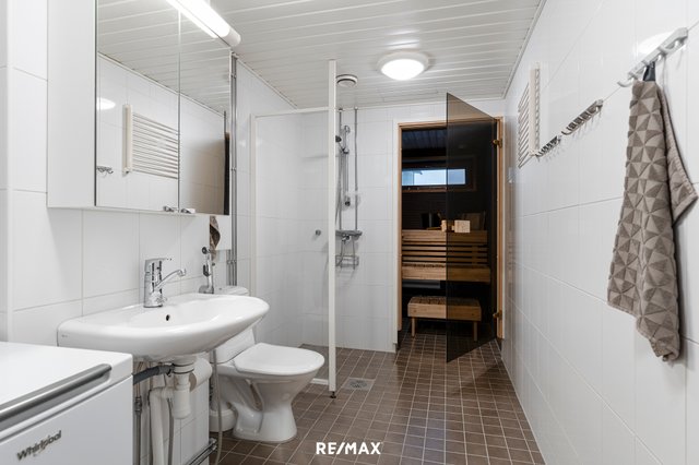 - WC-istuin, suihku, suihkuseinä, pesukoneliitäntä, lattialämmitys, peilikaappi, pesuallas, ja bidee-suihku