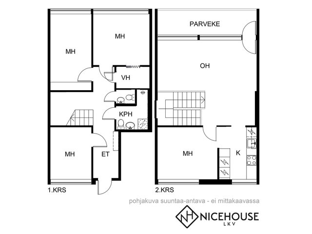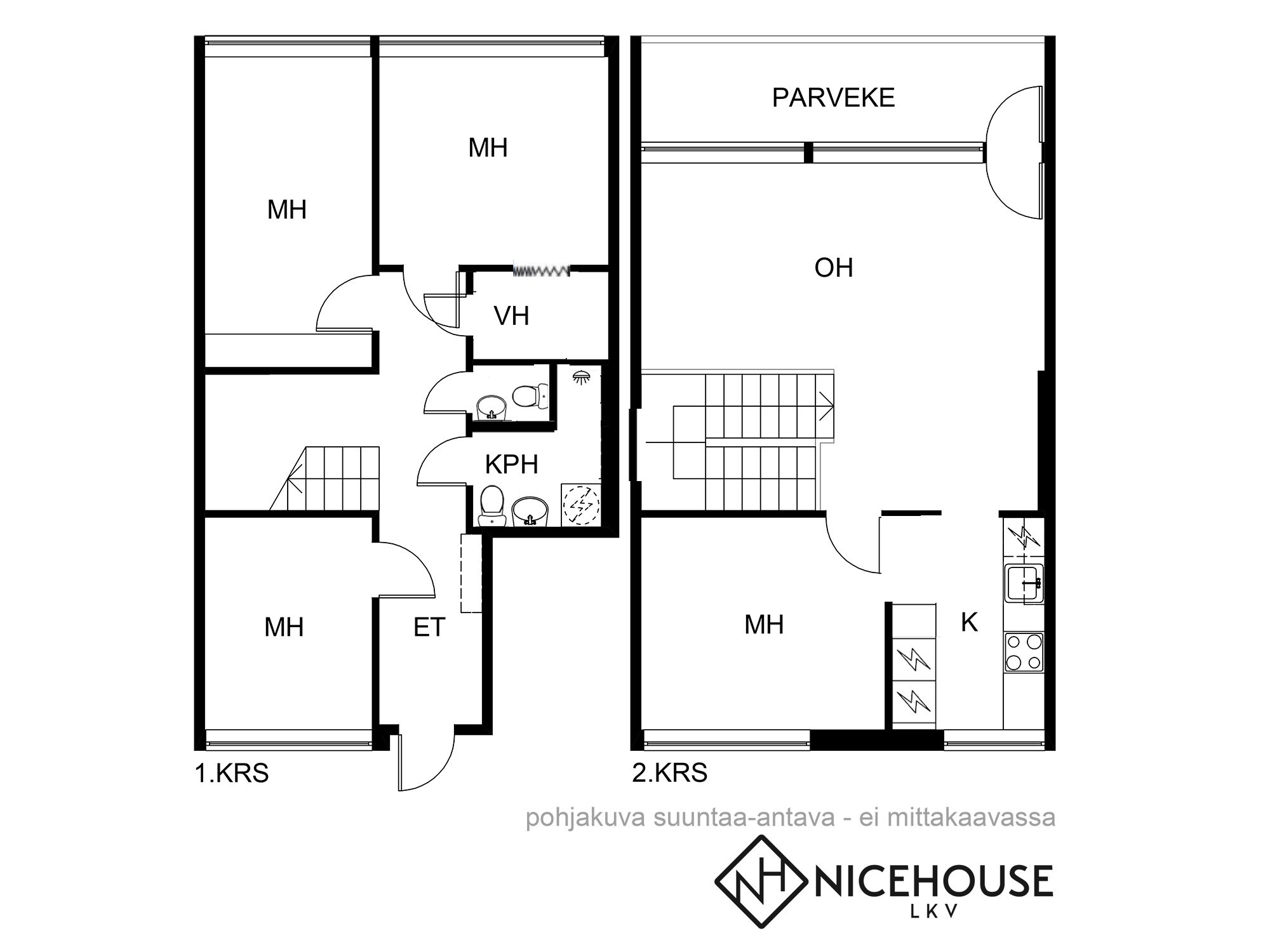 - Suurin makuuhuone sijoittuu yläkertaan keittiön ja olohuoneen lisäksi. Kolme makuuhuonetta alakerrassa.
