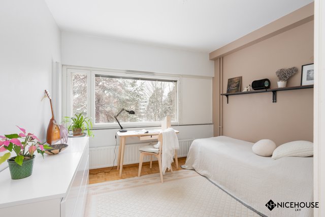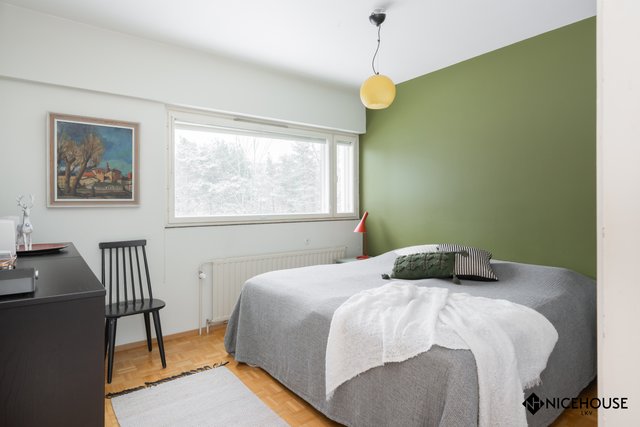 Kaikki neljä makuuhuonetta ovat tilavia. Kolme makuuhuoneista sijoittuu alakerran rauhaan kylpyhuoneen, erillisen wc:n sekä vaatehuoneen lisäksi. Neljäs makuuhuone on yläkerrassa, josta löytyvät myös avara olohuone, ruokailutila sekä tyylikäs vuonna 2025 remontoitu keittiö. Olohuoneesta on käynti parvekkeelle, missä pääset nauttimaan lämpimistä kesäpäivistä ja huikeista maisemista. Parvekkeelta on avoin ja metsäinen näkymä.