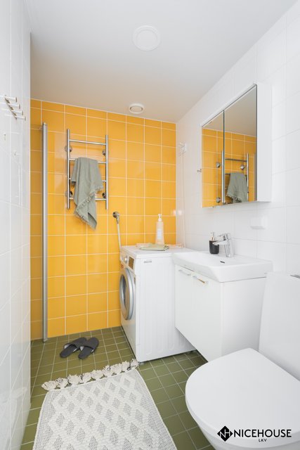 - WC-istuin, suihku, pesukoneliitäntä, pesuallas, allaskaappi, peilikaappi, suihkuseinä, ja pyyhekuivain