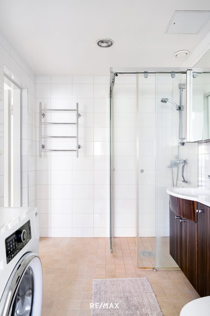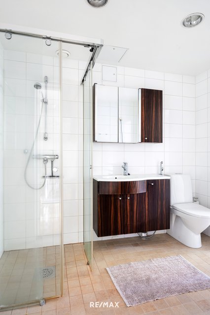 - WC-istuin, suihku, suihkuseinä, pesukoneliitäntä, peilikaappi, pesuallas, allaskaappi, bidee-suihku, ja lattialämmitys (Mukavuuslattialämmitys sähköllä)