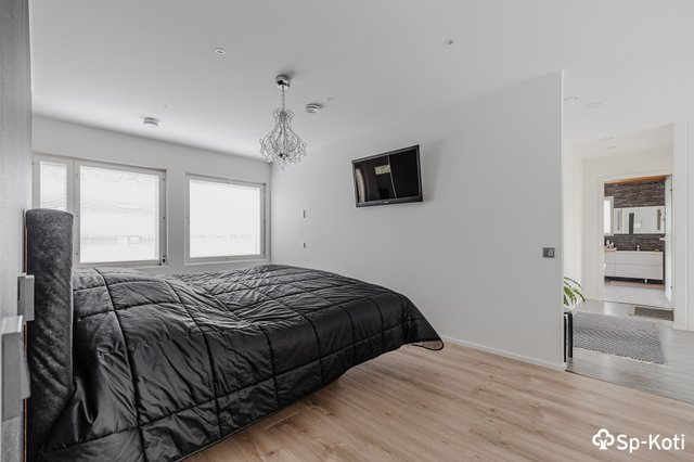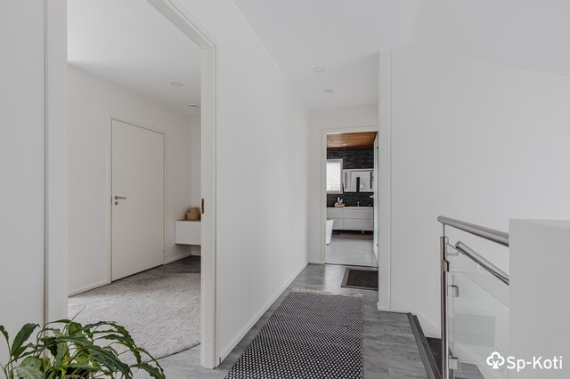 Yläkerrassa sijaitsee kodin kaksi muuta makuuhuonetta. Päämakuuhuoneessa arjen ylellisyyttä tuo oma ”walk in closet” vaatehuone. Pesutilat on varustettu kahdella suihkulla ja saunalla, jossa arjen huolet ja murheet unohtuvat hetkessä. Pesutiloista pääset vilvoittelemaan suoraan yläkerran tilavalle parvekkeelle.