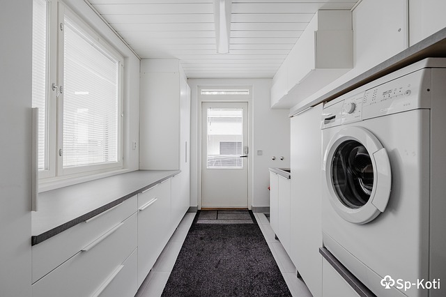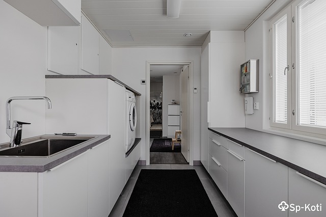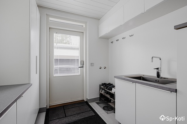 - Pyykkikaapit, lattiakaivo, lattialämmitys, pesuallas, pesukoneliitäntä, ja pöytätaso