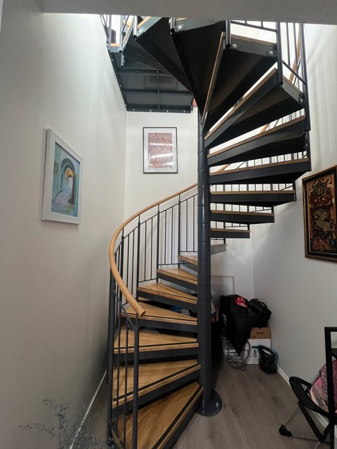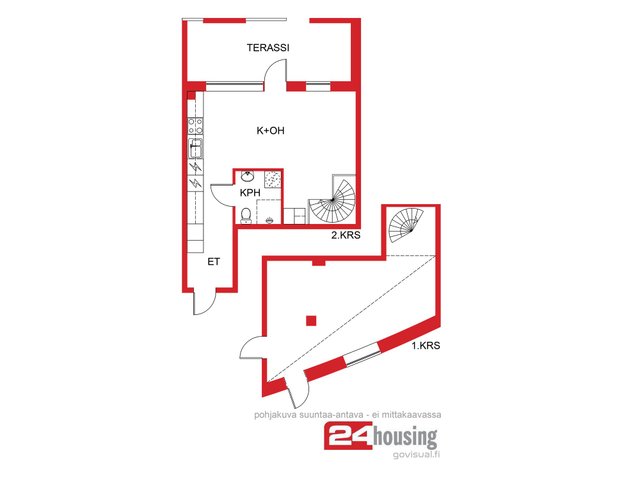Kahdenkerroksen asunnossa on näyttävät metallikaiteiset kierreportaat, kaksi sisäänkäyntiä ja tilava lasitettu terassi.