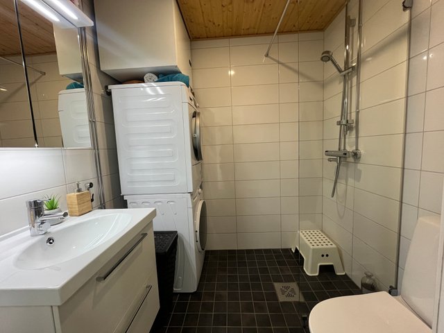 - WC-istuin, suihku, suihkuseinä, pesukoneliitäntä, lattialämmitys, peilikaappi, pesuallas, allaskaappi, ja bidee-suihku