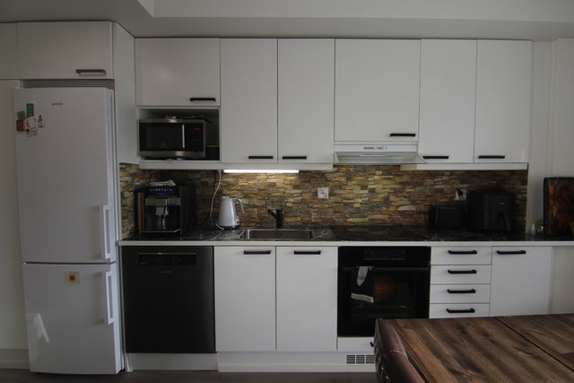 Tyylikkään, hyvin varustellun keittiön viimeistelee välitilan kivistruktuuripinta.