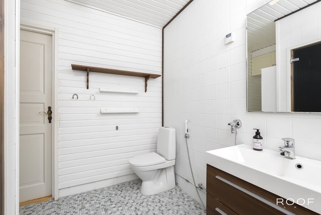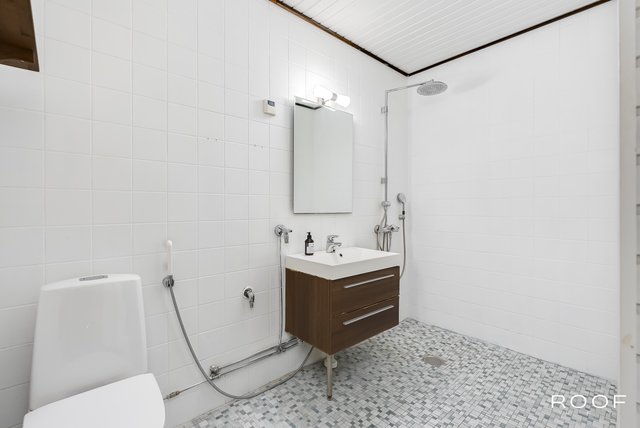 - Varustus: pesukoneliitäntä, lattialämmitys, wc-istuin, suihku, peili. Lattia: laatta. Seinät: kaakeli.