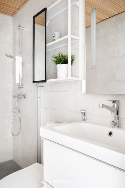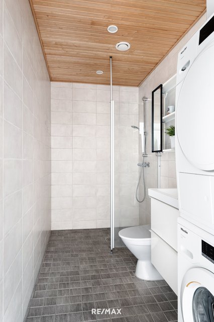 - Suihku, wc-istuin, suihkuseinä, pesukoneliitäntä, lattialämmitys, peilikaappi, pesuallas, allaskaappi, ja bidee-suihku