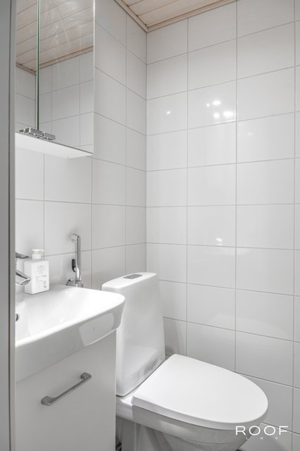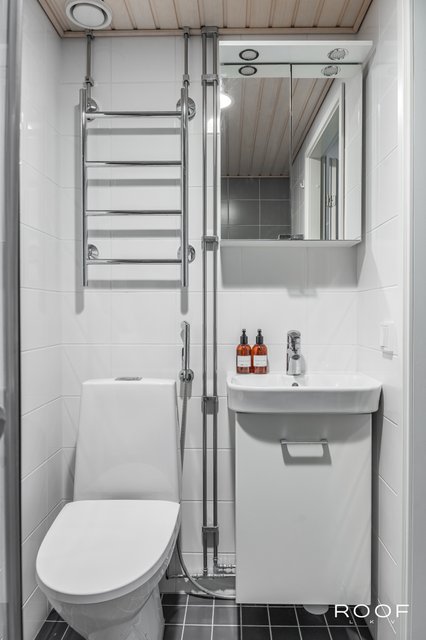 - WC-istuin, suihku, suihkuseinä, pesukoneliitäntä, peilikaappi, allaskaappi, ja bidee-suihku
