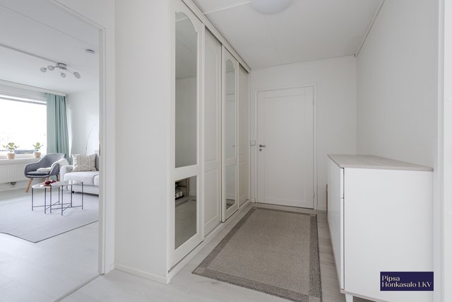 - Hyvänkokoinen eteisaula, jossa runsaasti säilytystilaa liukuovikaappien takana. Liukuovet mahdollistavat maksimaalisen kalustamisen eteisaulassa.