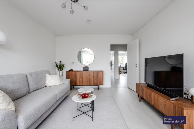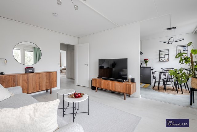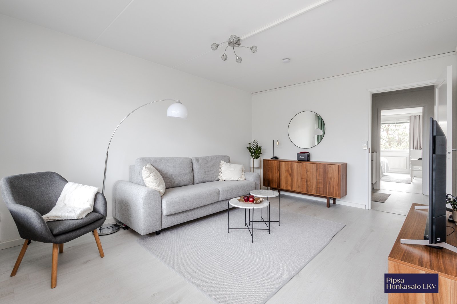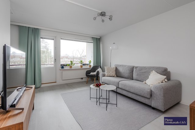 Olohuoneen avoin pohjaratkaisu tekee valoisasta tilasta helposti muunneltavan. Olohuoneesta on pääsy parvekkeelle, joka toimii lasituksensa ansiosta lisähuoneena keväästä syksyyn.