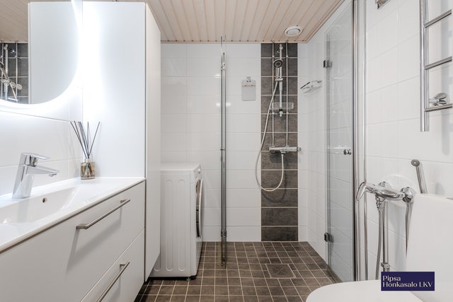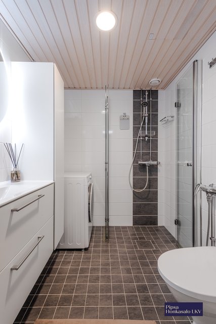 Kylpyhuone on harmonisin värein täysin uusittu vuonna 2018 linjasaneerauksen yhteydessä. Hyvän pohjaratkaisunsa ansiosta eri toiminnoille on riittävästi tilaa ja lasiset kääntyvät suihkuseinät mahdollistavat kylpyhuoneen maksimaalisen käytön. LED-valopeilin eri toiminnot ja mukavuuslattialämmitys tuovat luksusta arkeen.