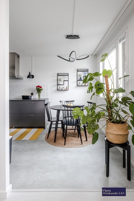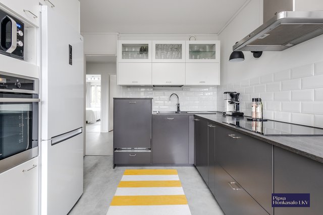 Asunnon keittiö on remontoitu tyylikkääksi vuonna 2018 laadukkain kodinkonein sekä aikaa kestävin materiaalein. Keittiössä on hyvin säilytystilaa useiden laatikostojen ansiosta sekä riittävästi pöytätasoa työskentelyyn. Keittiö jatkuu ruokailutilaan ison ikkunan äärelle.