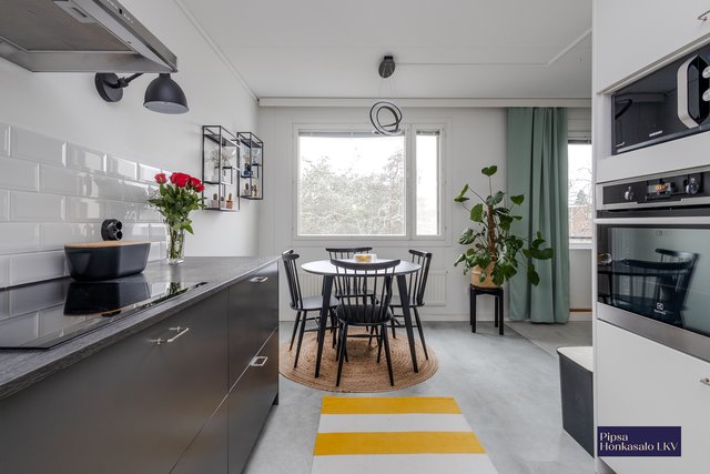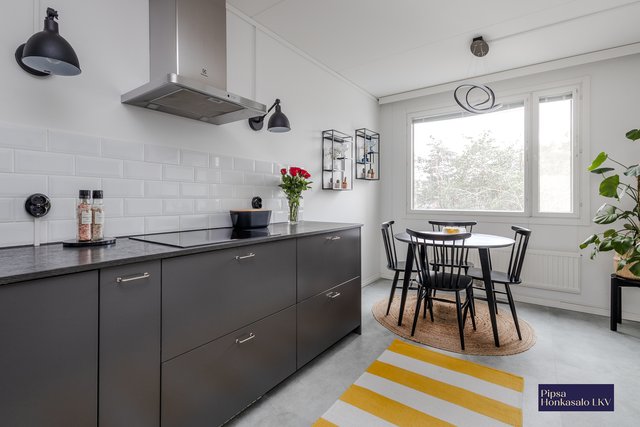 - Tyylikkäästi remontoitu keittiö, kaapistot ( 2018 rungot Ikea, tasot sekä ovet ja peitelevyt A.S.Helsingö), sähköinen roskiskaappi, jääkaappi / pakastin yhdistelmä (2021), induktioliesi, liedestä ohjataan liesituulettimen toimintoja (2018), erillisuuni (2018), aktiivihiilisuodatin (2018), astianpesukone (2025), seinät maali / välitilalaatoitus, lattia vinyylilankku.