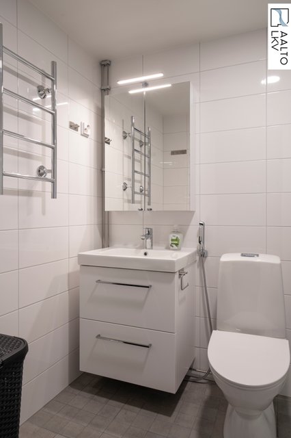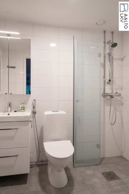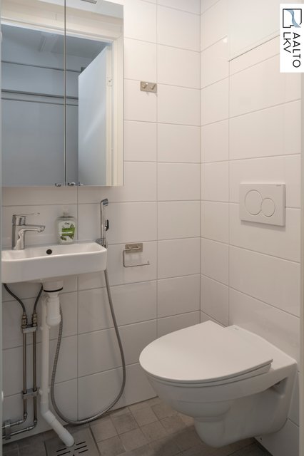 - WC-istuin, suihku, suihkuseinä, pesukoneliitäntä, lattialämmitys, peilikaappi, pesuallas, allaskaappi, ja bidee-suihku