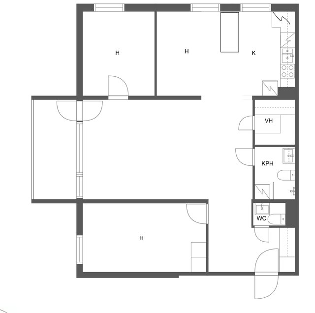 - yksi makuuhuone muutettu ruokailutilaksi, palautettavissa makuuhuonekäyttöön