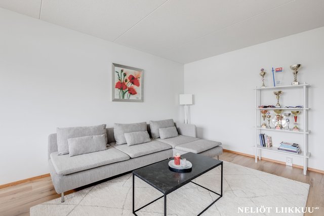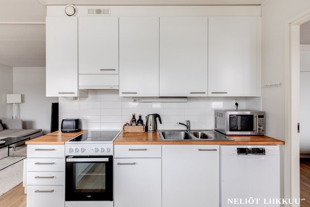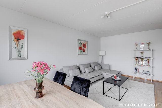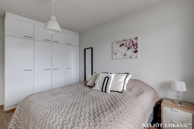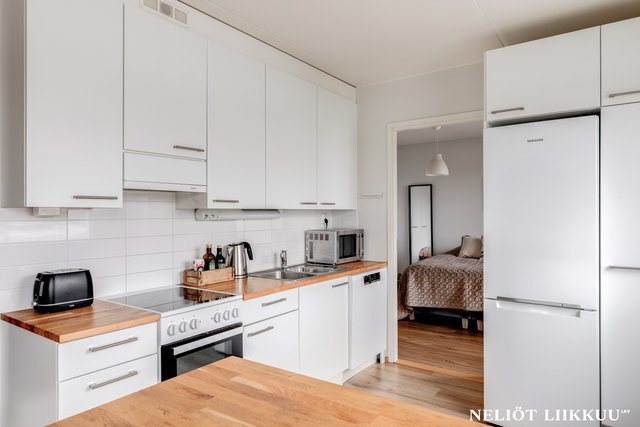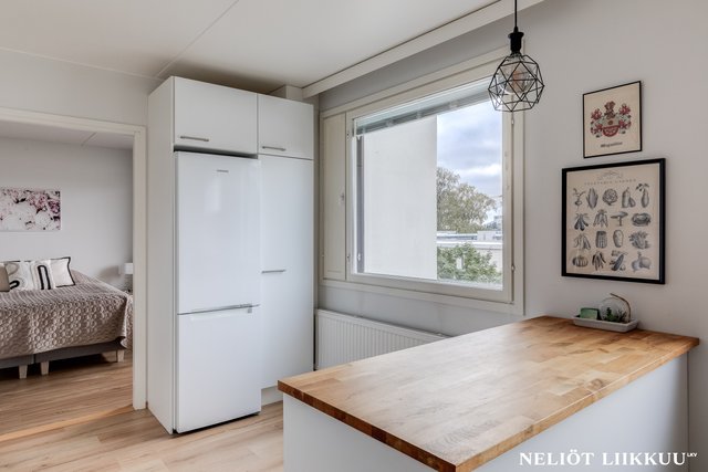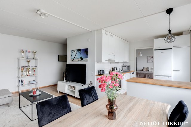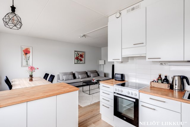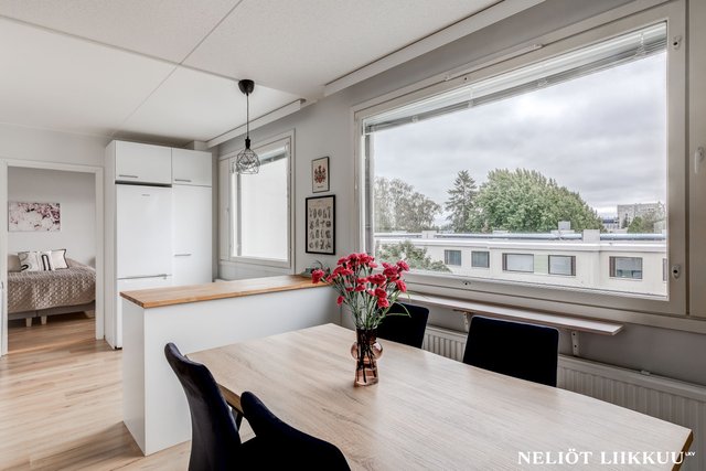 Vuonna 2019 täydellisesti uusittu koti odottaa uusia asukkaita. Kauniisti remontoitu keittiö yhdistyy avaraan olohuoneeseen, jonne mahtuu iso ruokaryhmä ja sohvaryhmä. Isosta makuuhuoneesta on käynti parvekkeelle, josta avautuvat kauniit näkymät kattojen ylle.